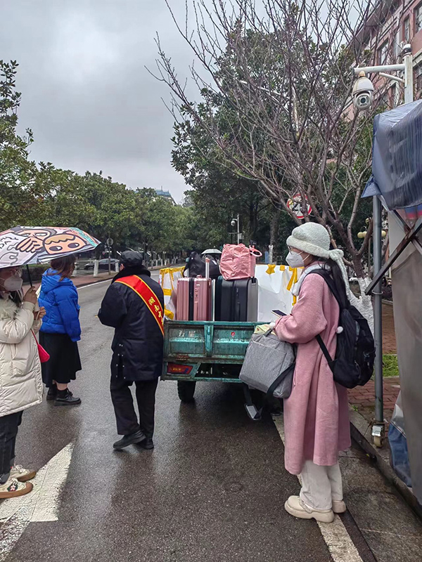 帶,為方便學(xué)生,我們還準(zhǔn)備了接送行李專車。今天雖然陰雨綿綿、寒風(fēng)陣陣,但是我們的員工仍然精神抖擻、熱情